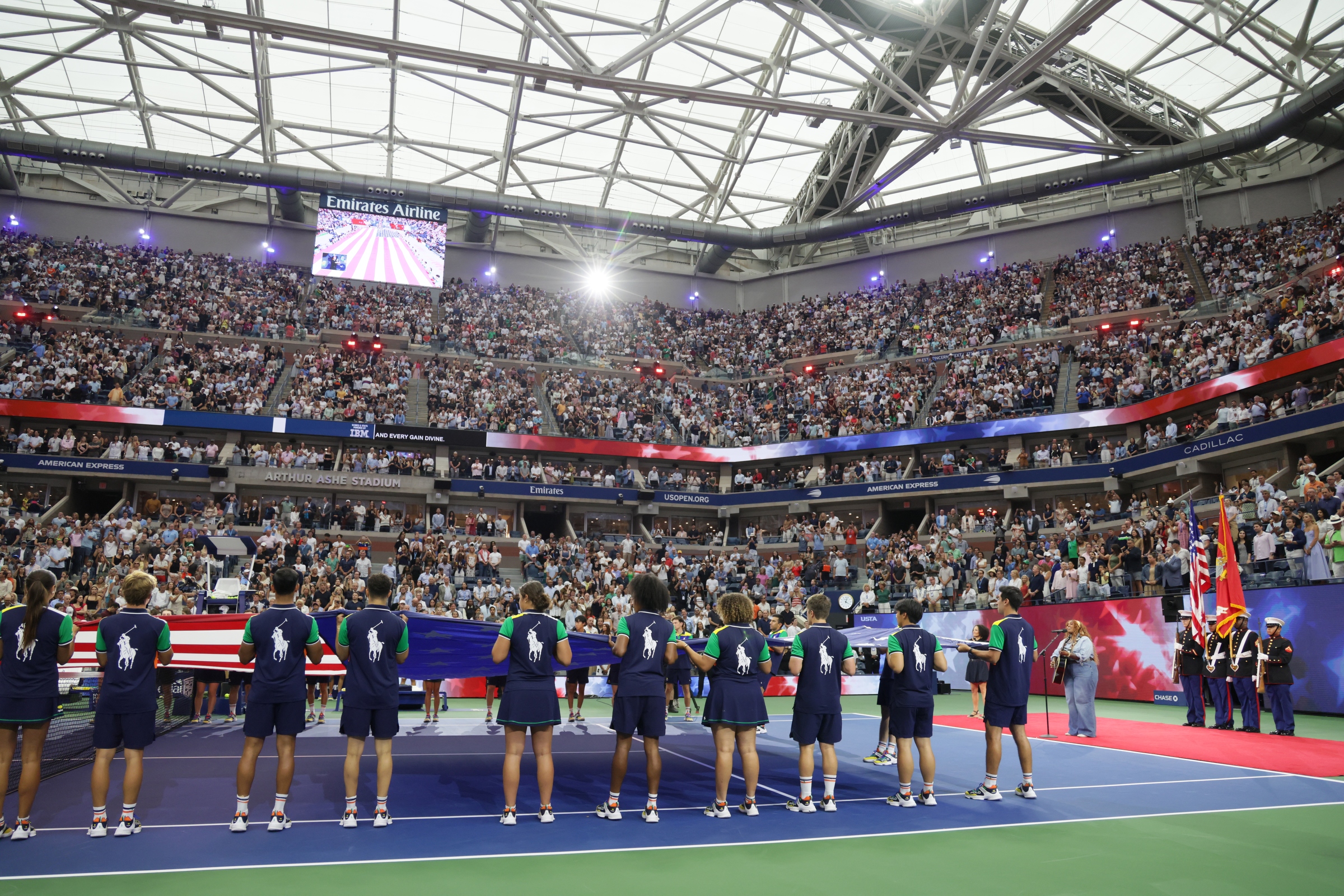女子決勝の試合前、シンガーソングライター、ブリトニー・スペンサー(右から5人目)が弾き語りでアメリカの愛国歌「America The Beautiful」を披露したセレモニーの様子。ボールパーソンが広げているのは巨大な星条旗。実にアメリカらしい演出だった 撮影:真野博正